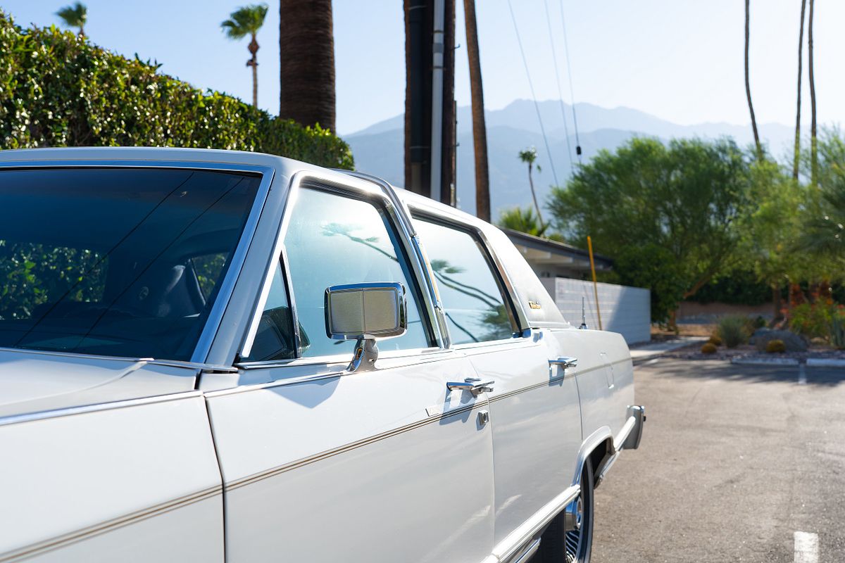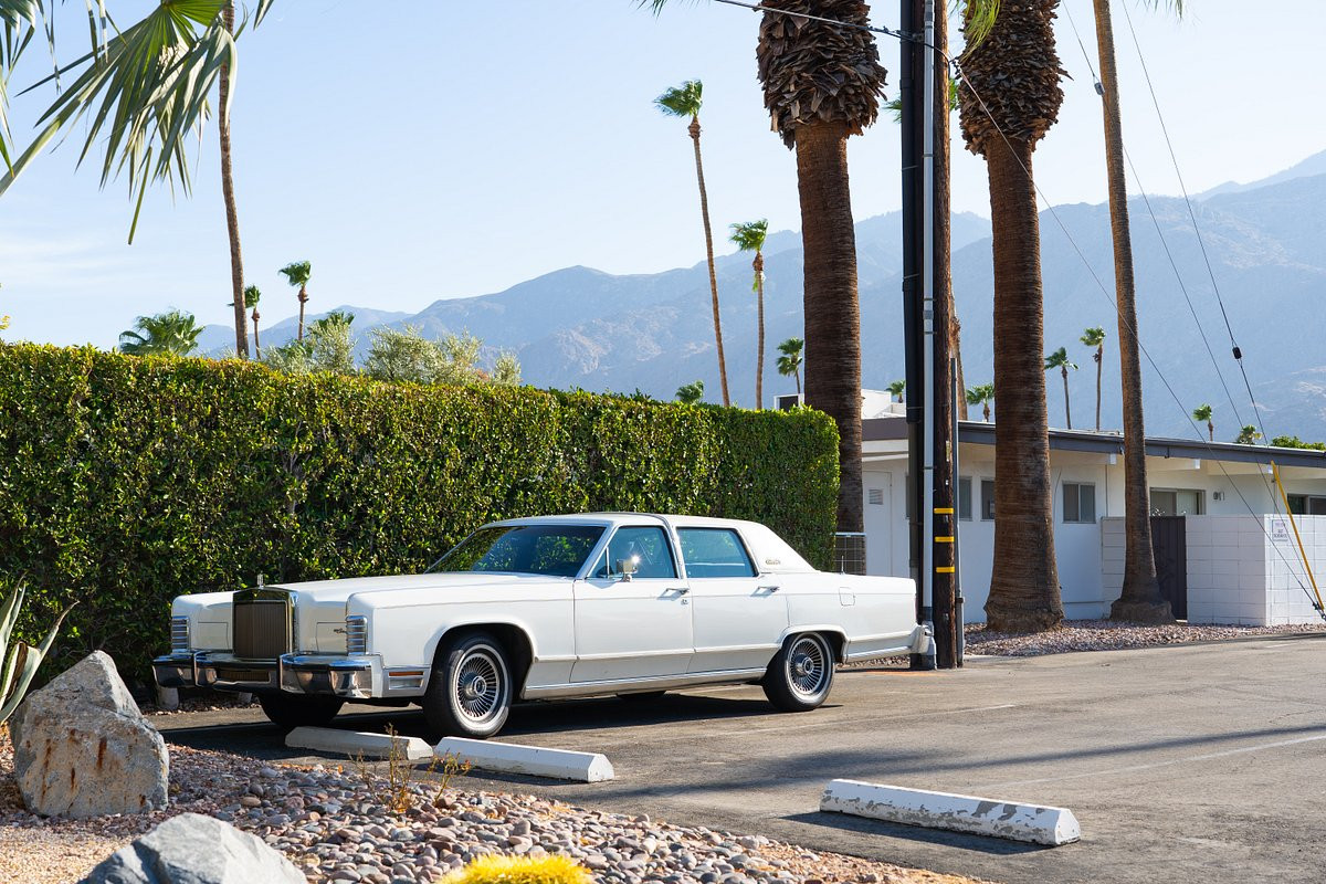 Our first stop was Vista Las Palmas, a neighborhood renowned for its classic mid-century modern homes. The clean lines, glass walls, and iconic butterfly roofs made for some fantastic shots. The evening light was perfect, casting long shadows and highlighting the bold colors and textures of these architectural gems. We got lucky and saw a couple of really cool cars parked outside. A 73’ Lincoln Continental and a Gold Studebaker.