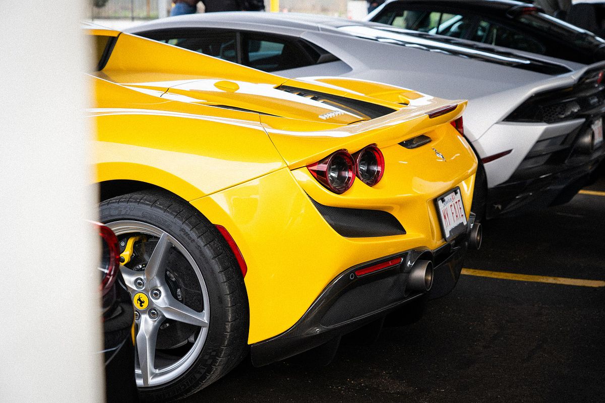 The outdoor venue showcased a stunning array of vehicles: Modern Lamborghinis with scissor doors reaching skyward, sleek Ferraris, technologically advanced McLarens, vintage and modern Porsches, and muscular Mercedes-AMG GTs. The sunset provided perfect lighting conditions for photographing these magnificent vehicles while owners laughed about the luck we had that day as it had been raining all morning.
